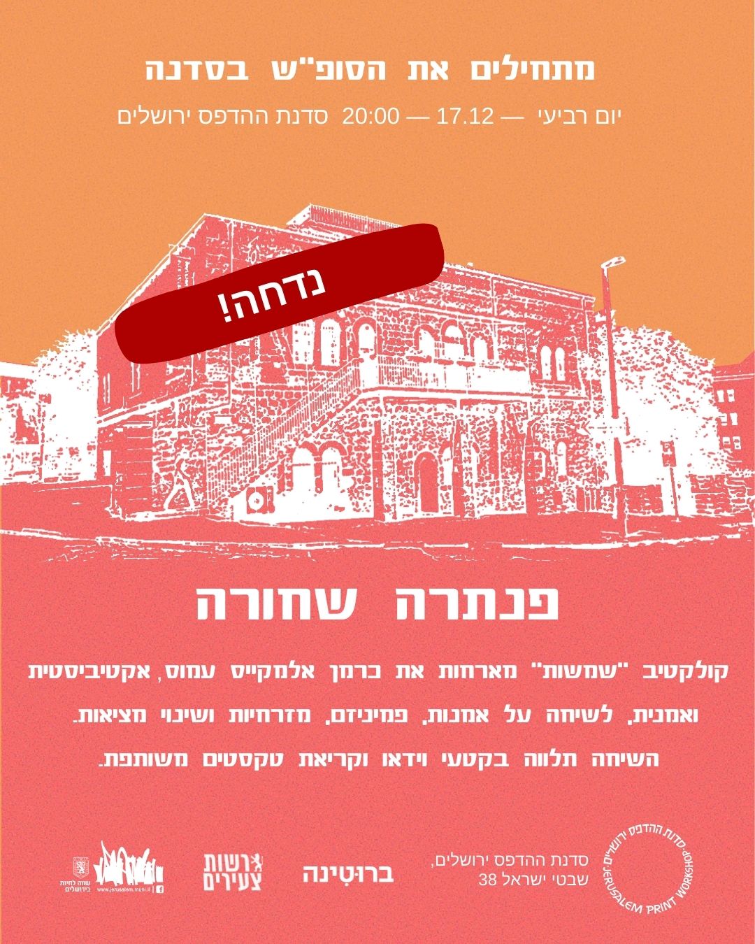 קולקטיב ״שמשות״ מארחות את כרמן אלמקייס עמוס, אקטיביסטית ואמנית, לשיחה על אמנות, פמיניזם, מזרחיות ושינוי מציאות. השיחה תלווה בקטעי וידאו וקריאת טקסטים משותפת. כניסה ב25 שקלים לתמיכה בעלויות ההרצאה